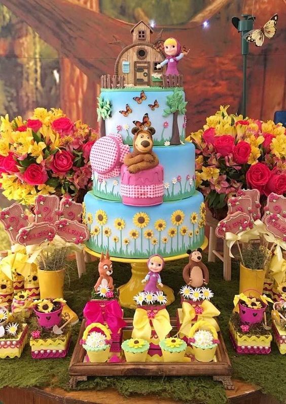 A mesa do bolo deve ser o centro das atenções. Cubra-a com uma toalha temática e posicione um bolo decorado com figuras de Masha e o Urso. Adicione cupcakes com topos dos personagens, biscoitos decorados e outras guloseimas. Não esqueça de incluir pratos, copos e talheres que sigam o tema, como descartáveis nas cores da paleta da festa.