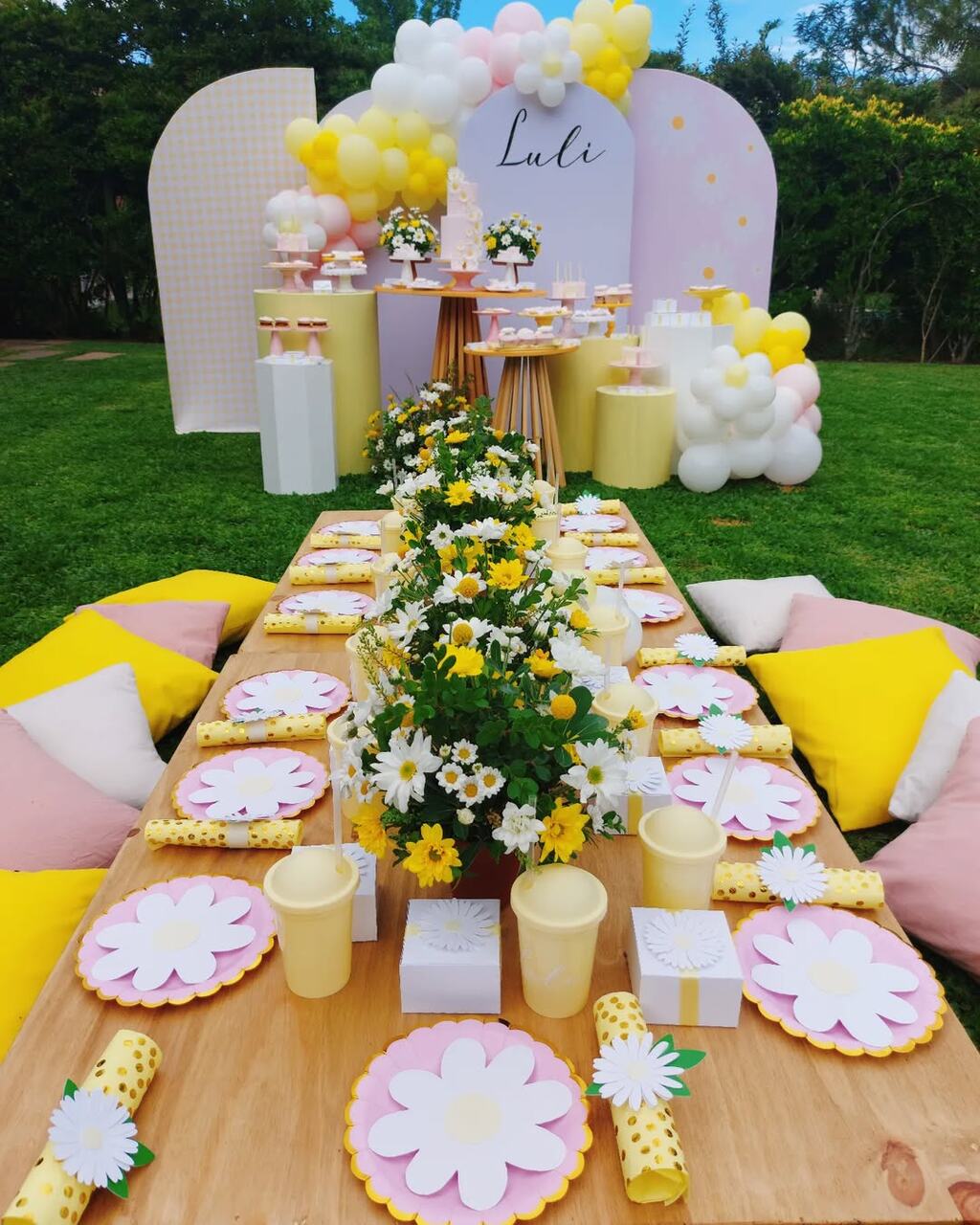 Uma das maiores vantagens da festa com tema margarida é a suavidade das cores predominantes. O branco e o amarelo são os tons clássicos, que remetem diretamente à flor. Para adicionar um toque extra de charme, uma excelente aposta é incluir o rosa claro, criando um contraste delicado e aconchegante.
