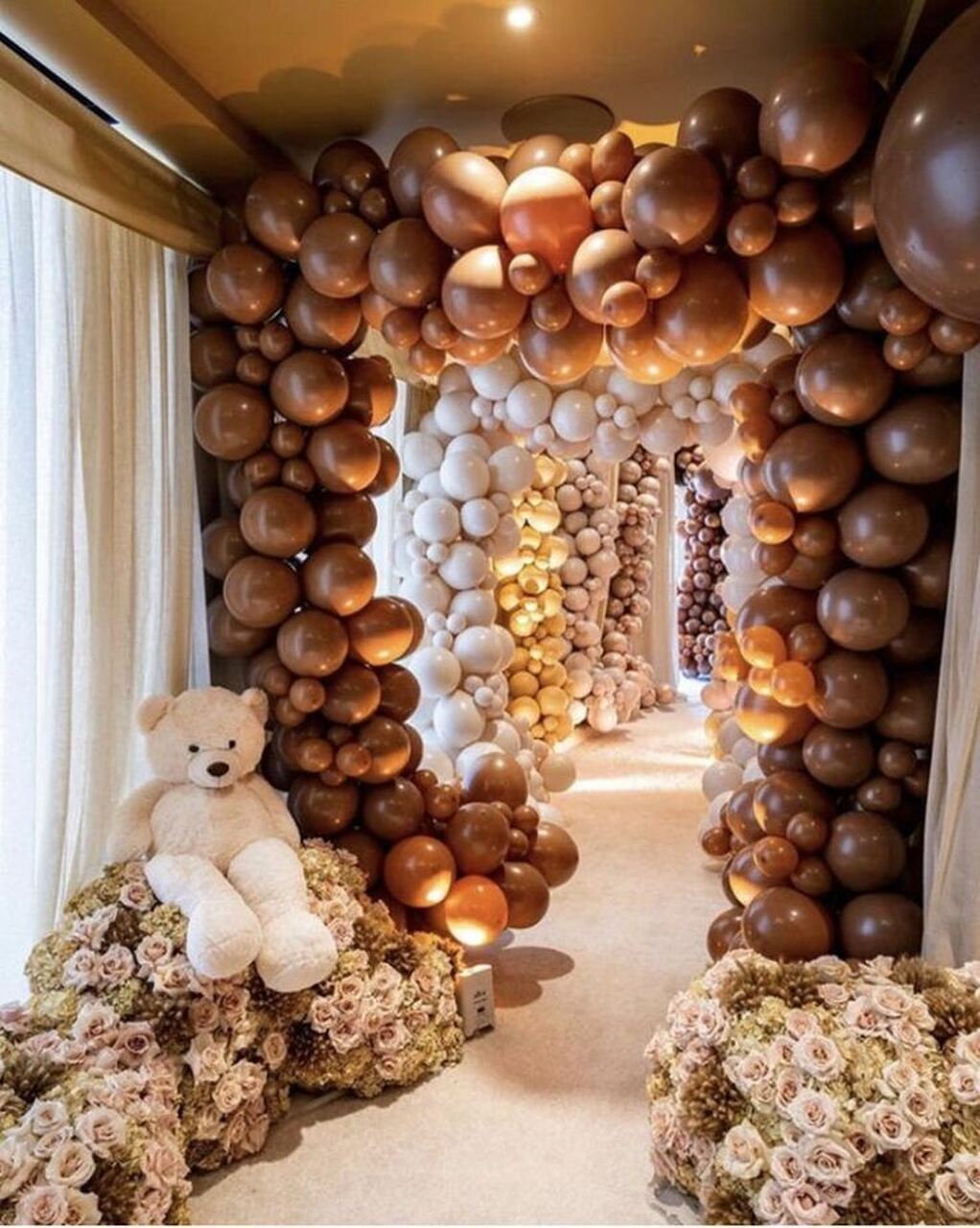 Hoje em dia, o mercado oferece opções em tons terrosos, perolados ou matte, ideais para compor arcos ou painéis sofisticados. Mescle balões mocha com nude, branco, dourado fosco e até um toque de cobre.