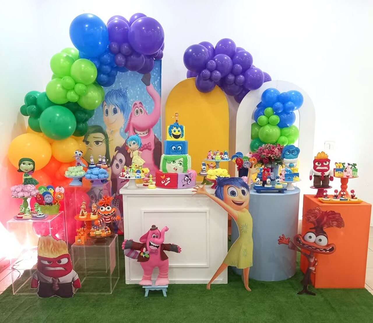 Para destacar ainda mais a decoração, os balões coloridos são aliados indispensáveis. Arcos desconstruídos nas cores principais do filme — azul, amarelo, vermelho, verde e roxo — ajudam a criar uma moldura vibrante para o painel.